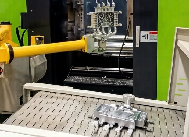 In this process, molten metal is injected at high speed into a water-cooled metal die or mold. Upon contact with the cooled surface, the molten metal solidifies rapidly. Once solidification is complete, the mold opens and ejector pins are mechanically activated to release the parts. The die is then exposed to air, sprayed with lubricant, closed, and ready for the next injection cycle.